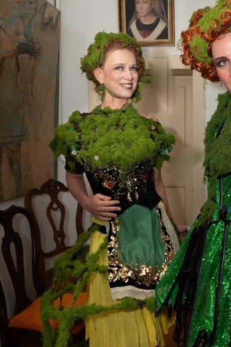 Somewhere between that first Saturday and the end of the carnival the following Tuesday I re-designed most of my costumes. I did not, of course, learn to sew in the allotted time, nor did I develop an artist’s eye for form. But I let myself take joy in the smaller, more playful acts of creation. I’d lost a necessary portion of a “French garden” party costume in transit -- I was supposed to be a topiary -- and at the last minute realized I could create it better with a ripped mesh top from an underwear store and three bags’ worth of fabric moss, painstakingly tied through the holes.